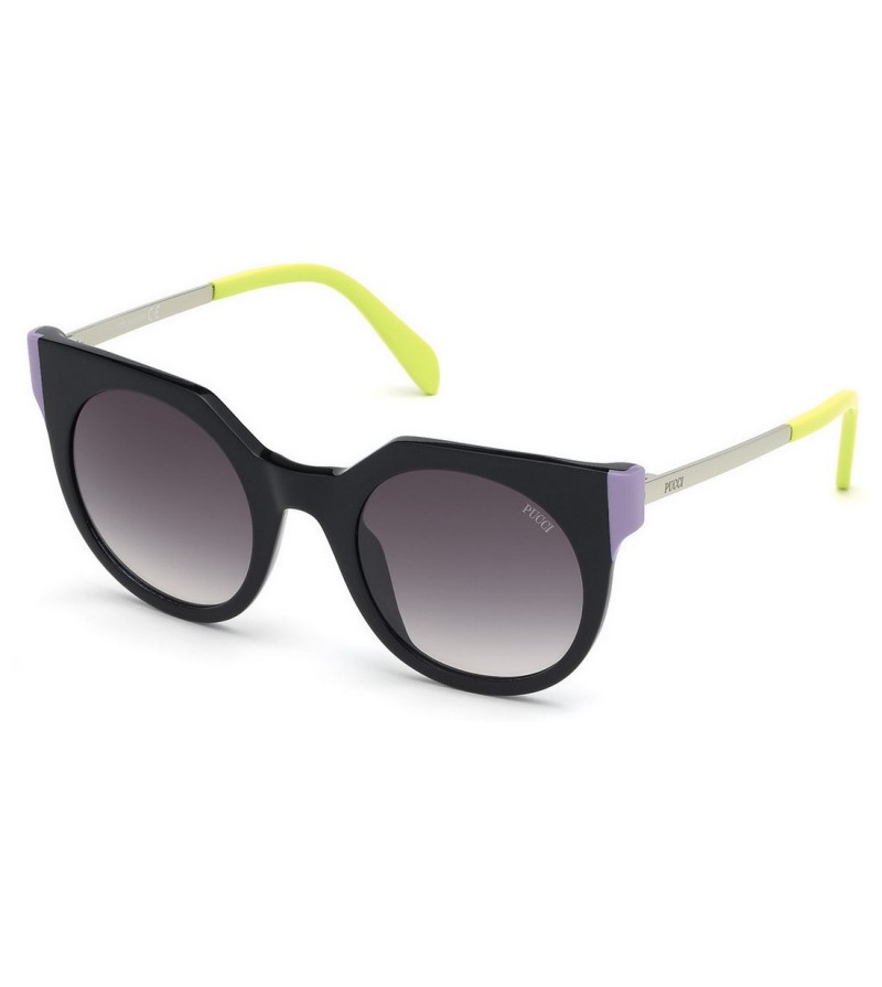 Occhiali da sole donna Emilio Pucci in celluloide con aste in metallo. Disponibile in due colorazioni,nero con dettaglio sul fronte viola aste dorate w terminale giallo acido. Marrone tartarugato con dettaglio corallo e terminale color crema.