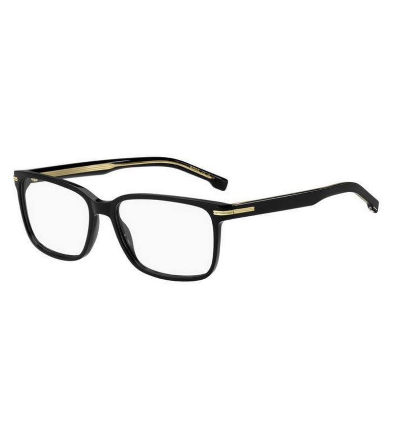 Occhiali da vista uomo Boss in celluloide nero o trasparente con dettaglio oro sulle aste.