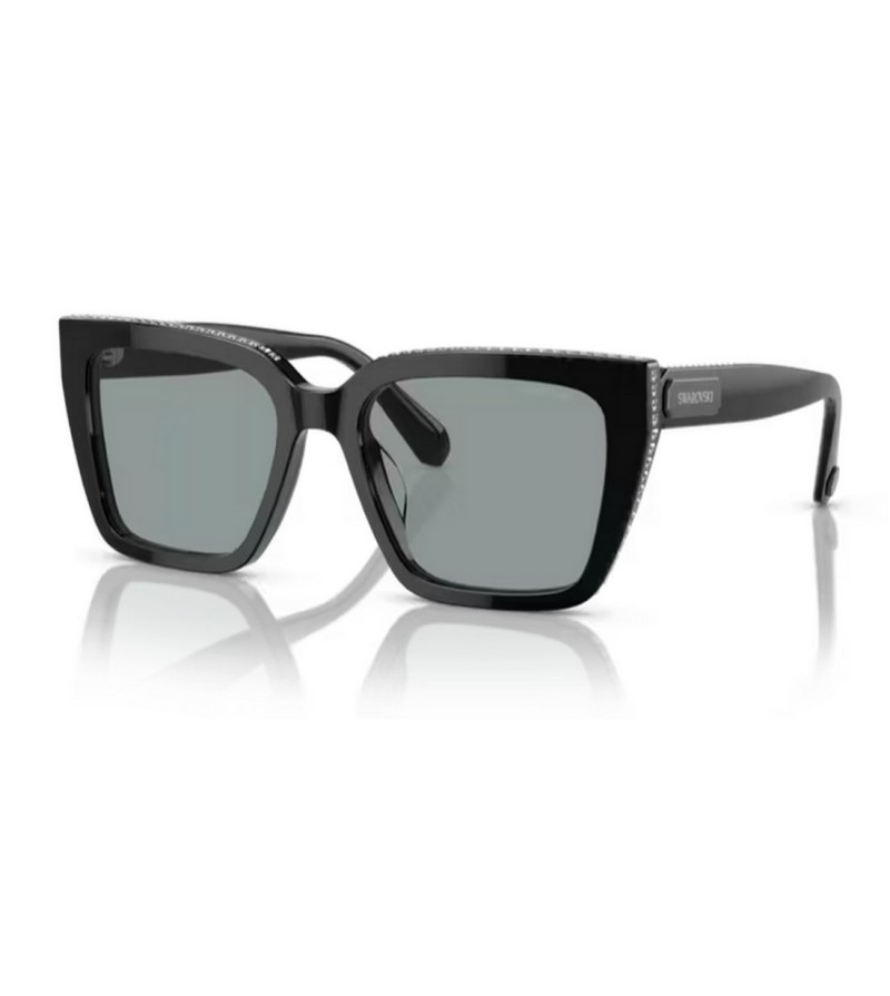 Occhiali da sole donna Swarovski in celluloide nero con strass e logo sulle aste.