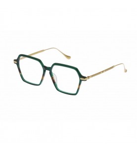 Occhiali da vista donna Kyme in celluloide verde con dettaglio marrone tartarugato e aste in metallo oro.