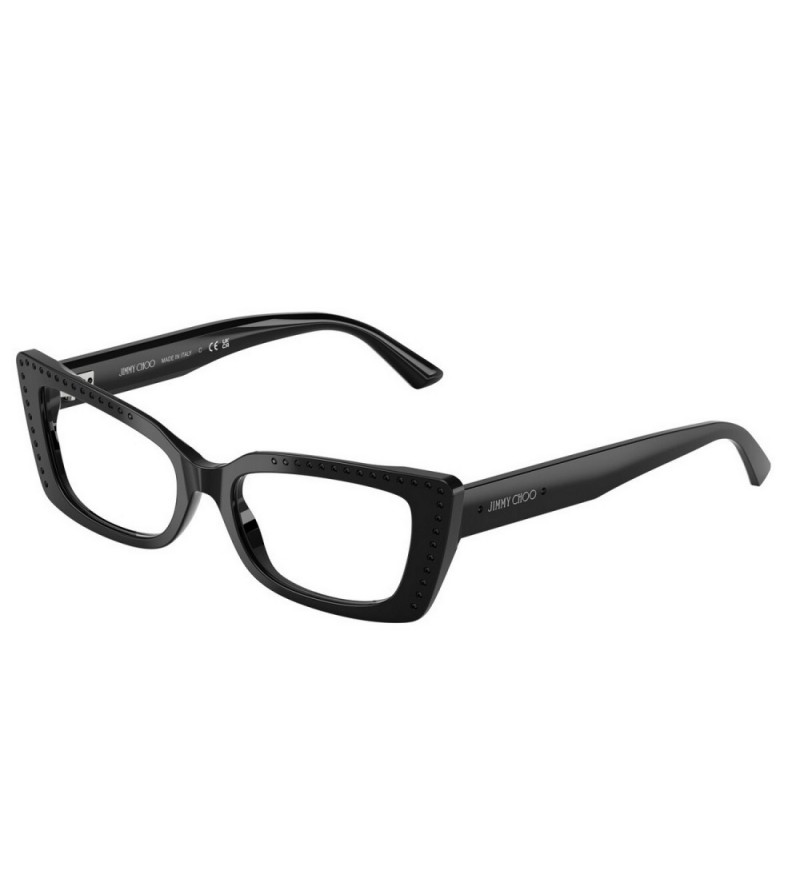 Occhiali da vista donna Jimmy Choo in celluloide nero con strass sul frontale neri e logo sulle aste.
