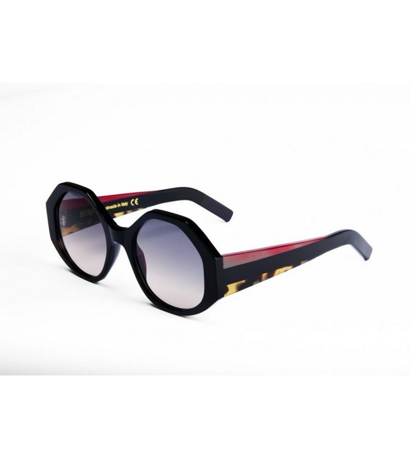 Occhiali da sole donna Bayria in celluloide con forma irregolare, lenti sfumate e aste con dettaglio bordeaux e tartarugato.