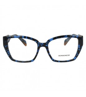 Occhiali da vista donna Borbonese in celluloide blu striato con il nero e trasparente con aste tartarugate.