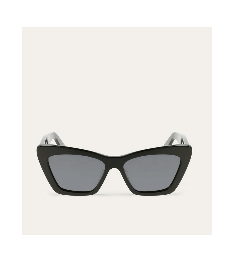 Occhiali da sole donna Ferragamo in celluloide nero o marrone tartarugato con lente uniforme e logo sulle aste.